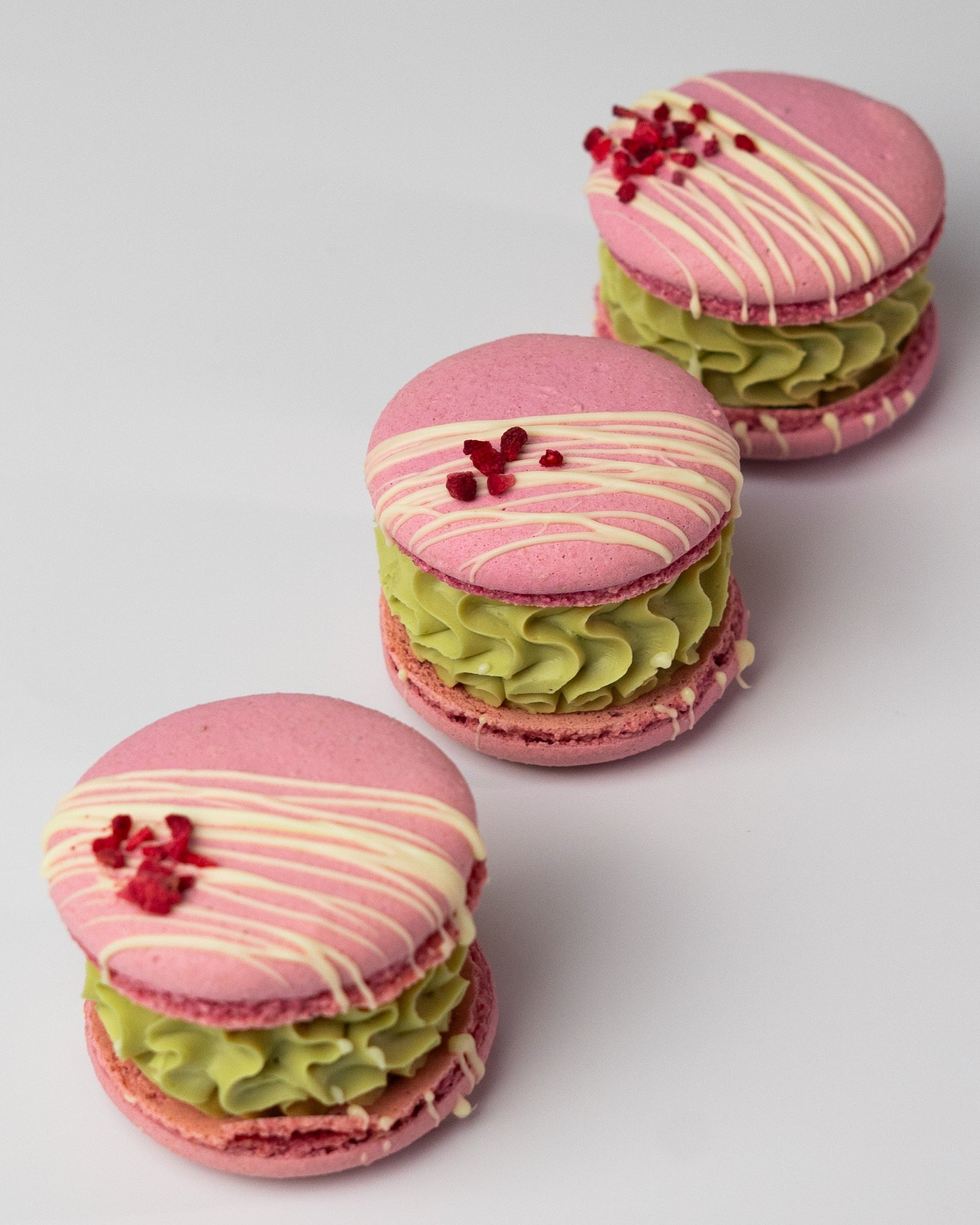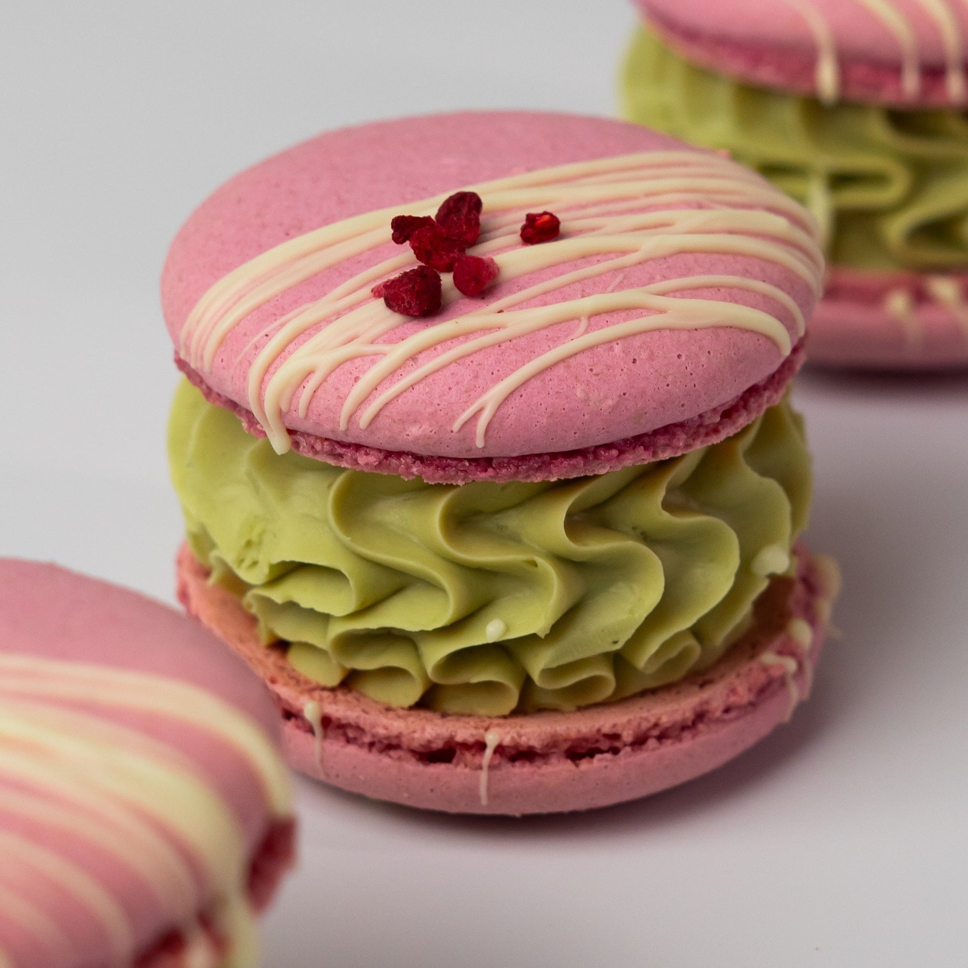 Nasze autorskie makaroniki na bazie mąki migdałowej. Nadziewane aksamitnym ganache pistacjowym oraz konfiturą malinową. Naturalne składniki, brak sztucznych aromatów i idealny balans między słodyczą a orzeźwieniem.